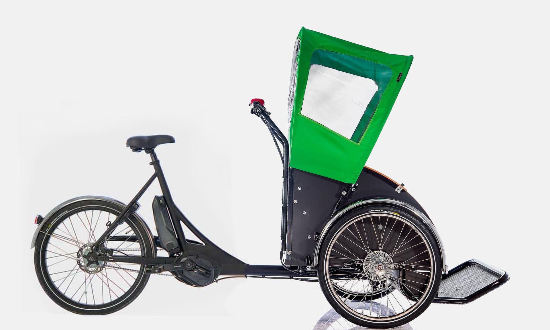 Das Modell CHAT fällt als Fahrrad-Rikscha sofort auf und sieht richtig schick aus. Das CHAT hat bei einer Gesamtbreite von 111 cm eine besonders breite Sitzbank von 100 cm und ermöglicht selbst den Transport zweier etwas stattlicherer Personen nebeneinander.